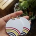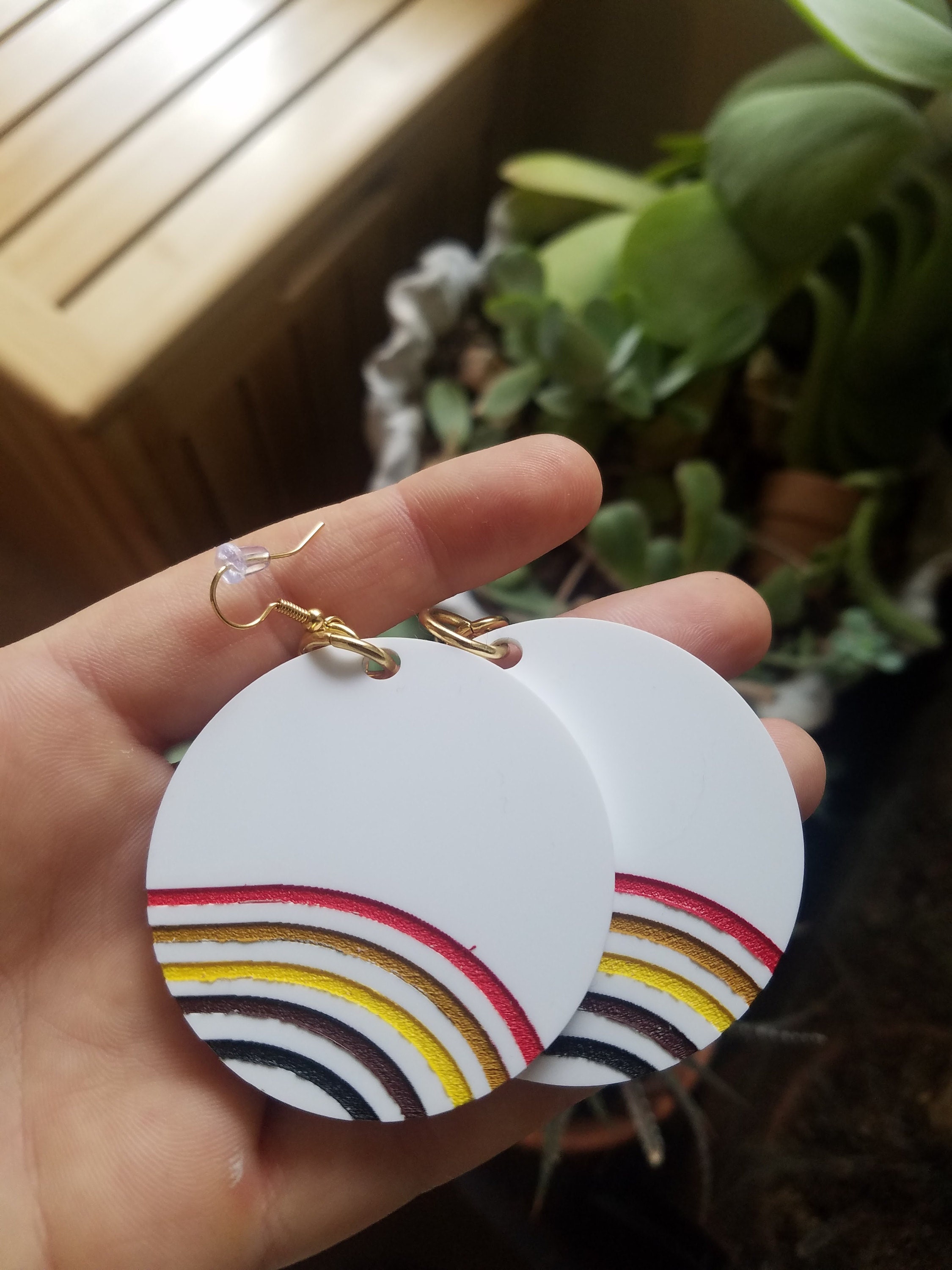 Handmade white acrylic earrings with hand-painted 1970s style rainbow stripes.